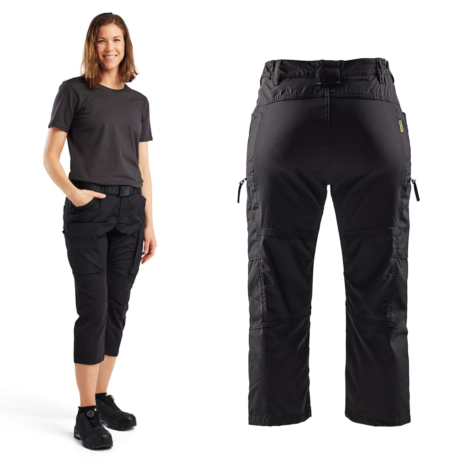Blåkläder 7129 Naisten piraattihousut ovat modernit, kevyet ja erittäin mukavat työpiraattihousut sisä- ja ulkokäyttöön. Materiaali kuivuu nopeasti ja stretch-paneelit lisäävät liikkumisvapautta. Housuissa on huolellisesti suunniteltu taskuratkaisu sekä oikea- että vasenkätisille, mukaan lukien verkkokankainen puhelintasku.